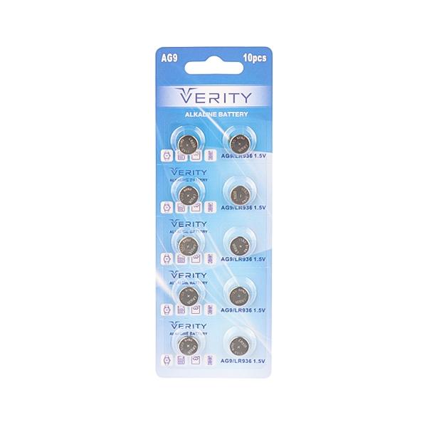 باتری سکهای آلکالاین AG9 وریتی با ولتاژ 1.5 ولت، یکی از باتریهای کوچک و باکیفیت است که با استفاده از تکنولوژی آلکالاین ساخته شده و برای استفاده در دستگاههای کممصرف طراحی شده است. این به صورت بستههای 10 عددی عرضه میشوند و هر جعبه شامل 20 کارت است که هر کارت شامل یک بسته 10 عددی میباشد.