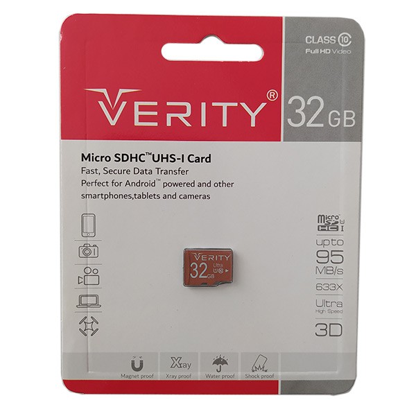 کارت حافظه Microsd 32G وریتی مدل C10 در برابر آب و شوک مقاوم بوده و 32 گیگابایت ظرفیت دارد. این کارت حافظه برای گوشی ها، هدست ها، اسپیکرها و تمام دستگاه هایی که دارای شیار کارت حافظه MicroSD هستند و تا حافظه 32 گیگابایت را پشتیبانی می کنند، مناسب است.